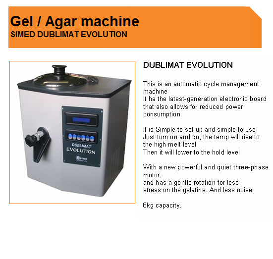Duplicating Gel Machine Duplimat NT is an anologue gel machine with a 6kg capacity and an auto cut off in the lid Duplimat Pro is a is a fully digital gel / agar Hydrocolliod gel machine with an 6Kg capacity The Ducagel is a 10 Program fully digital gel / agar Hydrocolliod gel machine with an 6Kg capacity The Gel Melt 8 is a fully digital gel / agar Hydrocolliod gel machine with an 8Kg capacity